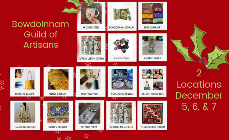 Bowdoinham Guild of Artisans Show & Sale (2 locations) – Old Town Hall, 13 School St.Friday, December 5th, 6:00 pm - 8:00 pmSaturday, December 6th, 10:00 am - 3:00 pmSunday, December 7th, 10:00 am - 3:00 pm Cathance River Gallery, 18…