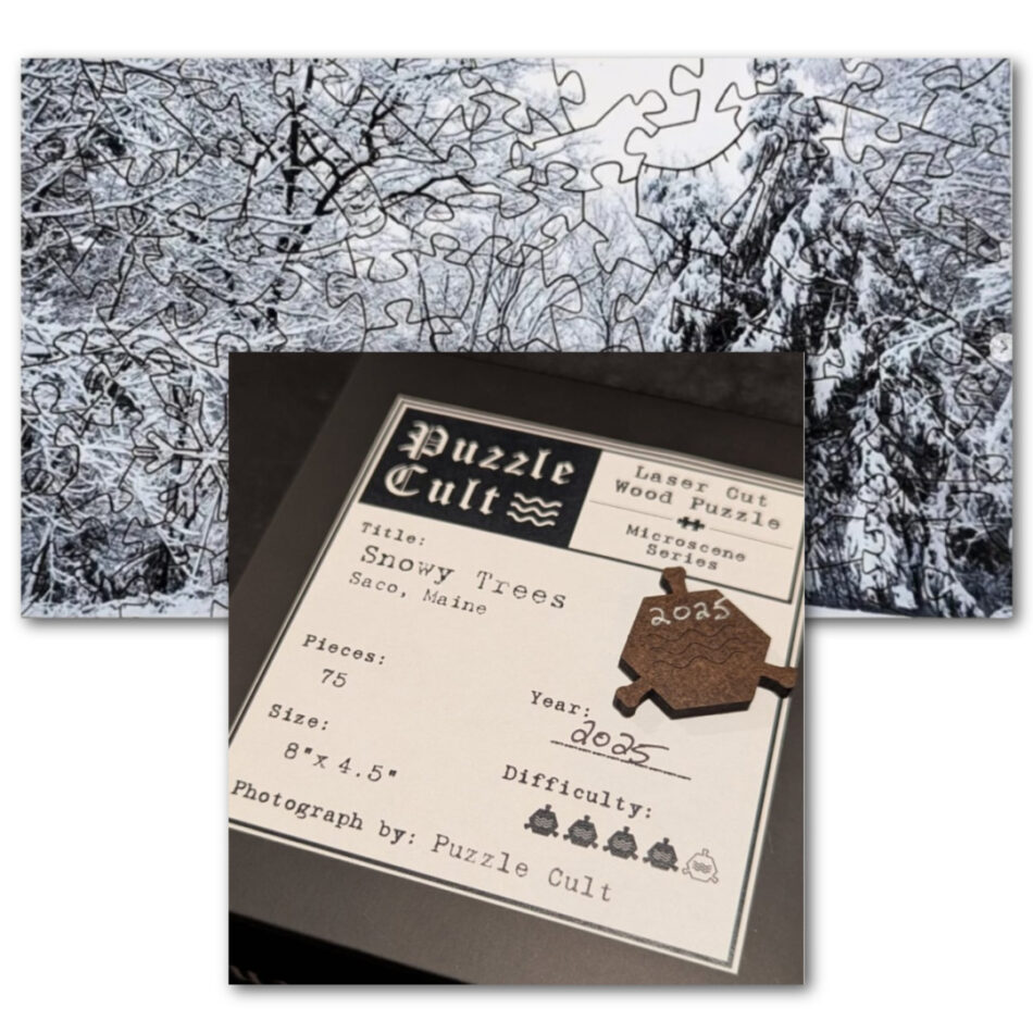 Our high quality wooden puzzles are made in Maine in small batches with original laser cut piece shapes we design to fit the theme of each puzzle. In keeping with old jigsaw puzzle traditions, we do NOT show or provide any artwork on our boxes.